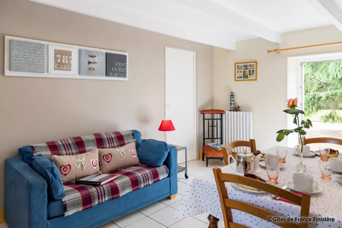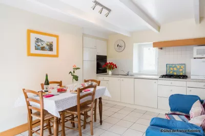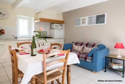 Bienvenue dans cette ancienne fermette en pierre, recouverte de grosses ardoises à seulement 10 minutes de la Baie de Morlaix. La maison a la particularité d'être entièrement au rez de chaussée. L'intérieur de ce gîte est fonctionnel et soigné. Vous disposerez d'un séjour avec coin cuisine lumineux. Les chambres possèdent une décoration chaleureuse qui inspire le repos. La première chambre possède un lit deux personnes et l'autre deux lits une personne. Pour votre confort, un petit coin salon avec canapé est à votre disposition. La maison, mitoyenne à celle du propriétaire, possède son entrée indépendante ouvrant sur son jardin fleuri clos (mur, haies) où vous passerez vos moments de détente, repas et pourquoi pas de sieste.