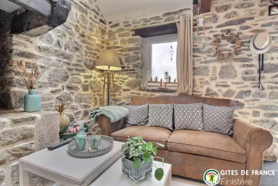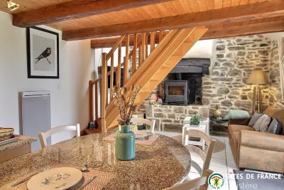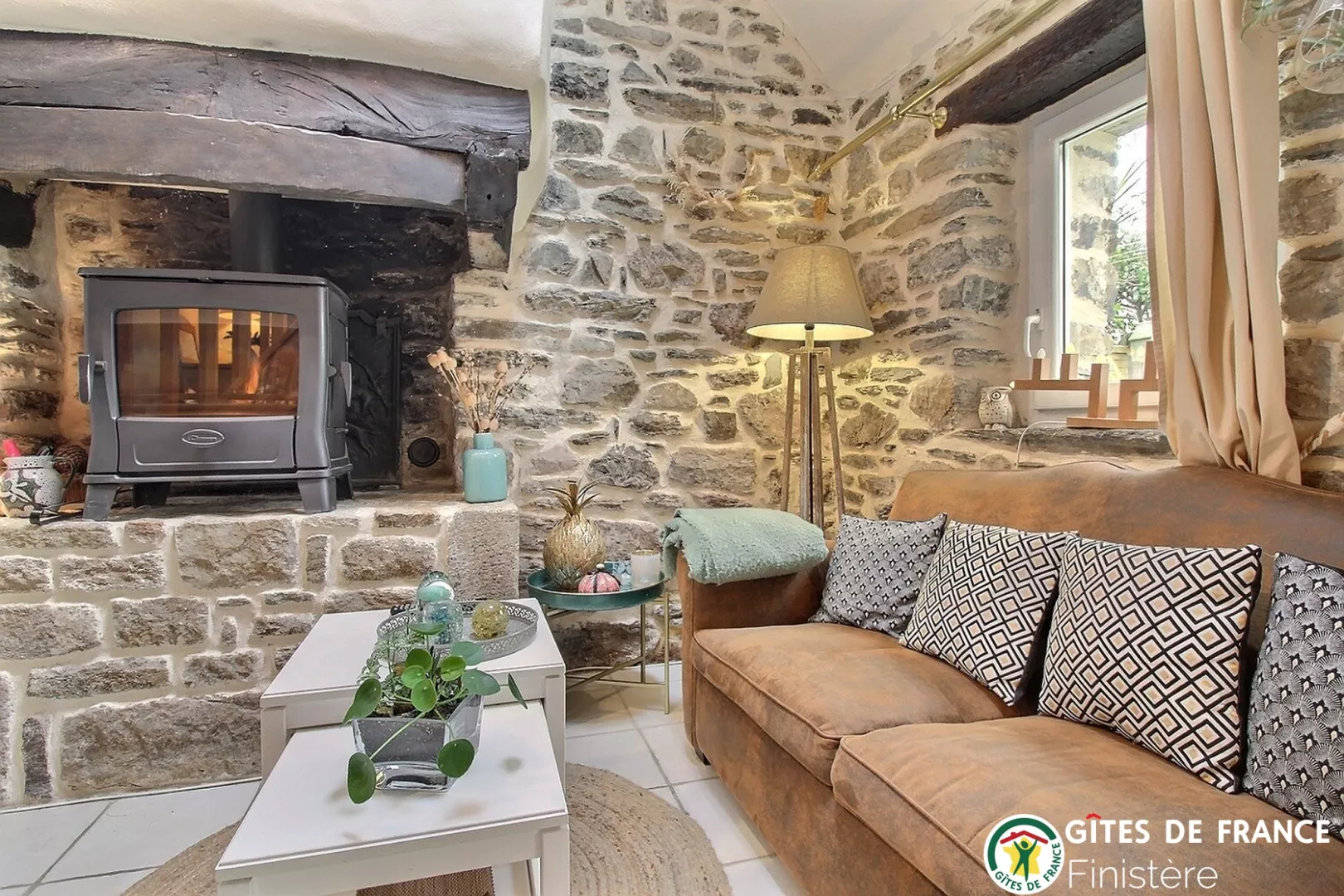 Atypique, ce gîte pour 2 personnes est composée de 2 petites maisons : l'une avec une charmante pièce à vivre comprenant une cuisine avec sa belle cuisinière, ouverte sur le séjour salon avec poêle à bois, une petite salle d'eau avec wc et à l'étage (à 1,80m de hauteur maximum), un espace nuit très mansardée en mezzanine, avec 1lit 2 personnes 140x190. L'autre maisonnette, avec accès par l'extérieur, est une belle chambre de plain pied avec plafond haut et un lit 2 personnes 160x200, avec salle d'eau et wc. L'ensemble dispose d'un jardin clos de palissades avec vue sur les Monts d'Arrée, à mi-chemin de Landerneau et de Landivisiau, ou de Morlaix et Brest. Le canapé est convertible en lit si la chambre extérieure ou la chambre mansardée ne convenait pas mais la capacité est de 2 personnes.
