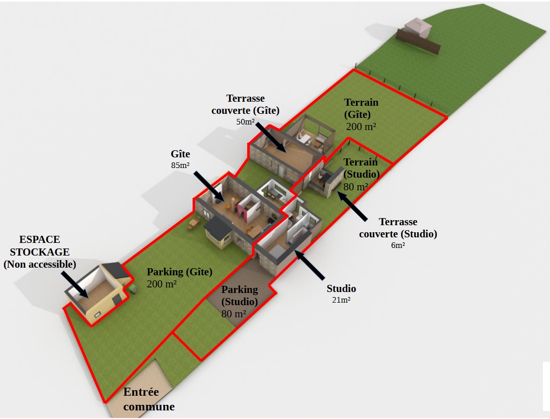 Mitoyen à un autre gîte pouvant être loués ensemble ou séparément, chacun dispose d'un parking sur le jardin à l'avant et d'un jardin clos privatif côté mer avec terrasse couverte.