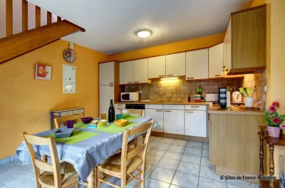 Ancien bâtiment rénové en deux gîtes contigus avec entrées indépendantes. RDC : séjour avec coin cuisine, salle de bains, wc. Etage : 1ch 1lit 2p, 1ch 2lits 1p, wc/lave main. Chauffage électrique (chauffage inclus), terrasse privative, jardin, salon de jardin, barbecue.